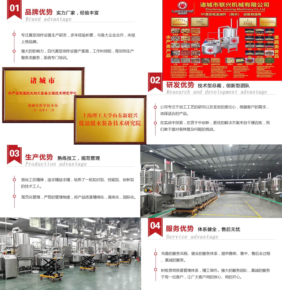 聯興第四代真空低溫油炸機顛覆了傳統意義上的真空油炸機工作時間長、工作效率低的概念。我公司通過大量客戶使用反饋,將設備進行改造升級,同等型號同等設備較傳統意義上的真空油炸機工作效率提高了30%,且我公司每臺設備零部件均有存檔,方便為客戶提供便捷迅速的售后服務。
